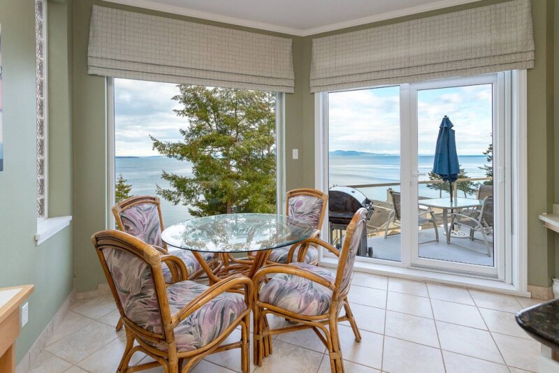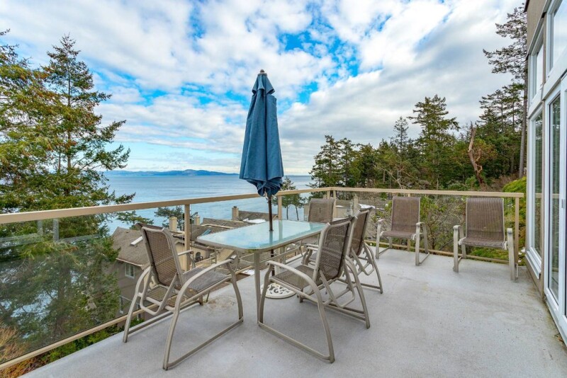 Seascape, an exclusive waterfront luxury townhouse development in popular Cordova Bay with spectacular 180 degree views east to Haro Strait and Mount Baker and direct access to the beach. You will love this private free standing three bedroom/three bathroom end unit featuring a great layout with ocean views from almost every room. Enjoy the sunrises and sunsets from numerous outdoor balconies, peace and quiet with an abundance of nature, trees and grassy knolls, and wildlife viewing. The main floor layout is superb with huge kitchen and eating area, lovely sunken living room, open dining room, a main floor bedroom/office and two piece bathroom. Imagine what you could do to update this to your standards. Upstairs, a beautiful primary bedroom and ensuite with soaker tub, walk in closet, and a second bedroom with ensuite too. East and west facing decks to soak up the sun all day. Double car garage, and so much storage for your toys! Hiking, golf, biking trails and beaches abound, while all amenities, steps away.