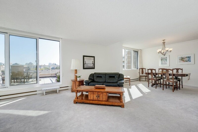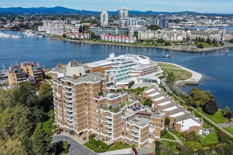 Life here is a holiday! Outstanding Views from the astonishing 1041 square foot ocean front terrace and luxury amenities are included in this rare three bedroom/two bathroom James Bay condo. The sunny unit offers so much potential to redesign for pique elegance. Beautiful ocean view bedrooms, primary with ensuite and walk-in closet. Dedicated laundry room, seperate large pantry and linen closet provide ample storage. Kitchen with cozy breakfast nook flows to the spacious dining and living room and out to the unrivalled terrace with greenhouse. Prestigious Laurel Point’s top-tier amenities are heated outdoor pool, library, party room, workshop, fab fitness center, sauna and car wash. EV parking and extra storage for the unit. Secured gate to waterfront walkway and it’s steps to downtown Victoria, the Museum, the Empress and great shops and dining. Its an easy stroll through charming James Bay for essentials and Fisherman’s Wharf,Dallas Road and Beacon Hill Park. A hidden gem blending vibrant city living with tranquil waterfront serenity. Live wonderfully!.