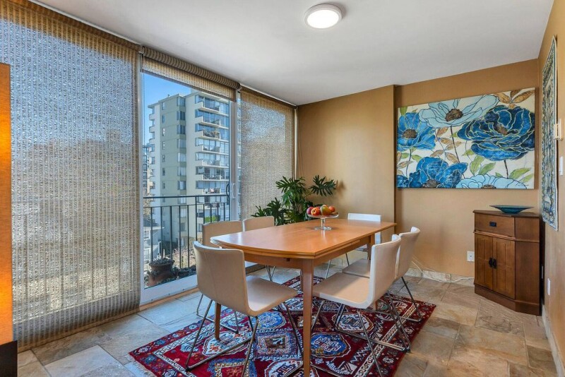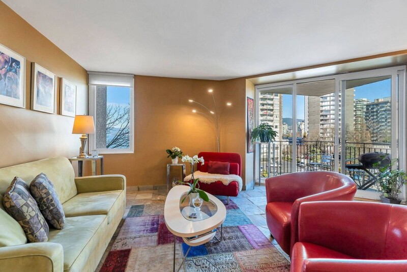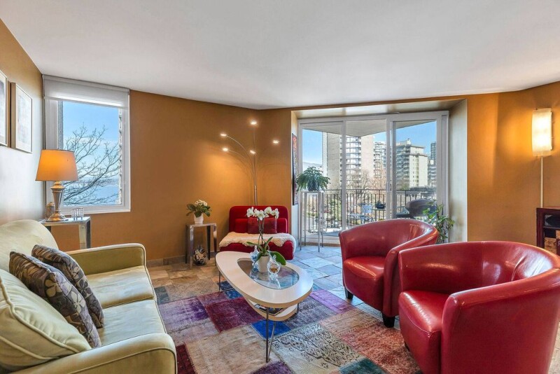 Plaza del Mar located on the famous Beach Ave overlooking English Bay! Spacious NW corner two bedroom, two bathroom plus den/office of 1330 sq ft also offers two balconies. Mountain, ocean, and city views can be captured from most rooms in this fully updated home. Open kitchen with island cooktop offers granite counters, newer appliances, and bar seating for two. Living, family and dining can accommodate house size furnishings. Entertain watching ocean views and fireworks from the living room balcony or step out to the second balcony from the primary bedroom for morning coffee with sunrise vistas to the water. The king-size primary bed features well designed four-piece ensuite and wall of closet. Denoffice could be a third single bed. Value ocean breezes year-round without the need for A/C. Covered parking. Pet and Rental friendly.