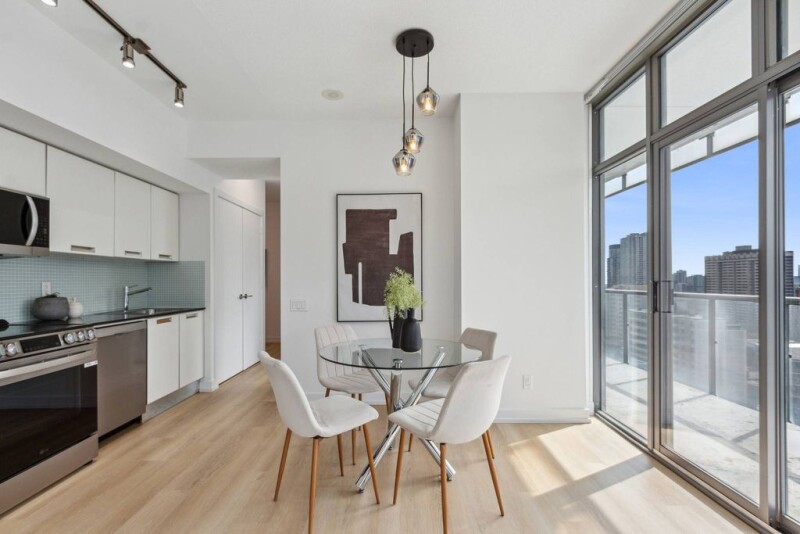 Experience the epitome of Italian-inspired high design in this remarkable corner unit at the highly sought-after Casa Condominio Residenza. This approximately 827 square foot condo offers an unparalleled urban living experience, blending sophisticated aesthetics with modern functionality. You will adore the open-concept living, dining and kitchen area, bathed in natural light pouring through expansive floor-to-ceiling windows. The seamless flow of this space creates an inviting atmosphere, perfect for entertaining and everyday living. The Scavolini kitchen boasts sleek black granite countertops, a striking glass mosaic tile backsplash, and brand-new, stainless-steel appliances, ensuring culinary creations are a pleasure. Beyond the interior, an unbelievable wrap-around balcony just under 300 square feet, with private outdoor space offering breathtaking city vistas. This expansive balcony space extends your living area, providing an exceptional setting for summer patio drinks, relaxation, or simply enjoying the vibrant cityscape. This thoughtfully designed residence features two bedrooms, in a split plan for optimal privacy. The clever 4-piece bathroom, ingeniously designed with a privacy sliding door, effectively creates the feel of two separate bathrooms, adding an extra touch of convenience and luxury. 9-foot ceilings and freshly painted walls. The space is bright and airy. Included with this exceptional property are the convenience of parking and a locker. Located just south of Yorkville, you'll be immersed in the city's most vibrant entertainment scene. Enjoy tons of restaurants, upscale boutiques, Cineplex and Eataly at the Manulife Centre and all everyday amenities. With the subway close by, commuting is effortless, connecting you to the entire city with ease. This is more than just a condo; its a lifestyle at Casa.