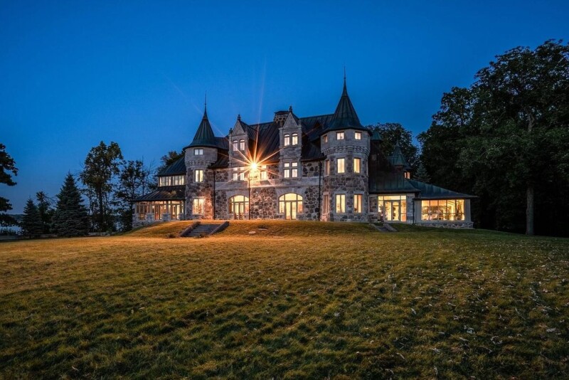 Access an authentic stone castle, ¨Bois de la Roche¨, with an interior area of approximately 18,427 sq ft, (3 floors + basement) built in the 19th century, inspired by the Loire castles and reigning over its 19.69 acre domain, a peninsula (Pointe Forget) in the Lake of Two Mountains, on the Island of Montreal. Completely rebuilt interior while preserving imposing historical & architectural components, this is a rare & original ensemble, on a site of breathtaking beauty that stands out. With uninterrupted panoramic views of the lake, it is accessed through an imposing gateway & a magnificent estate via a long private wooded avenue.