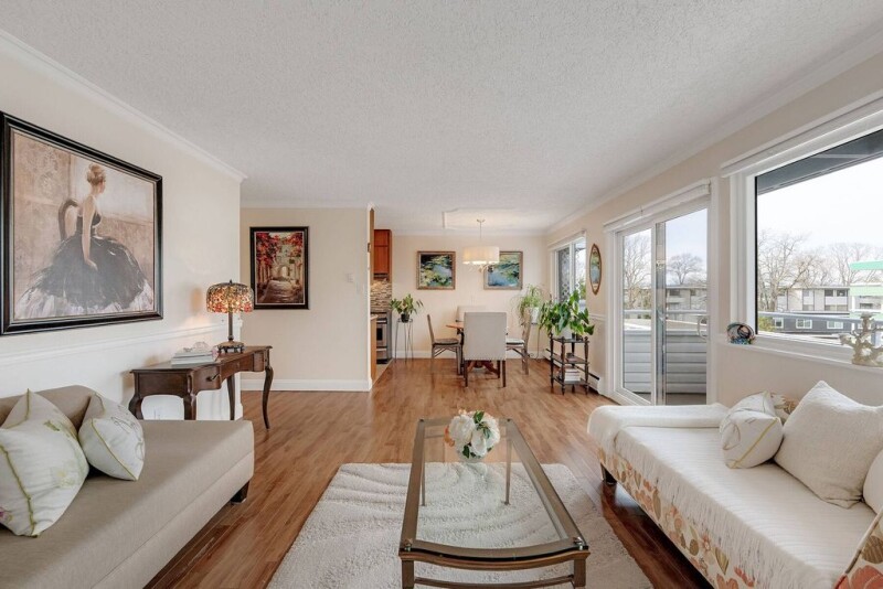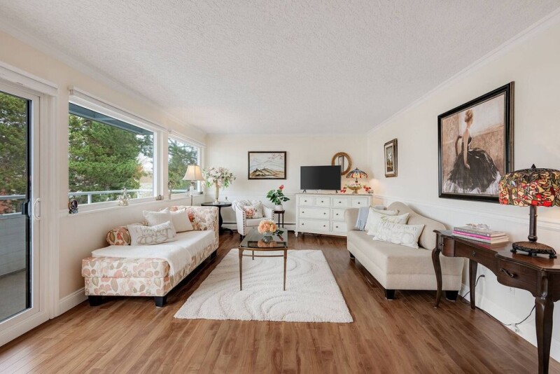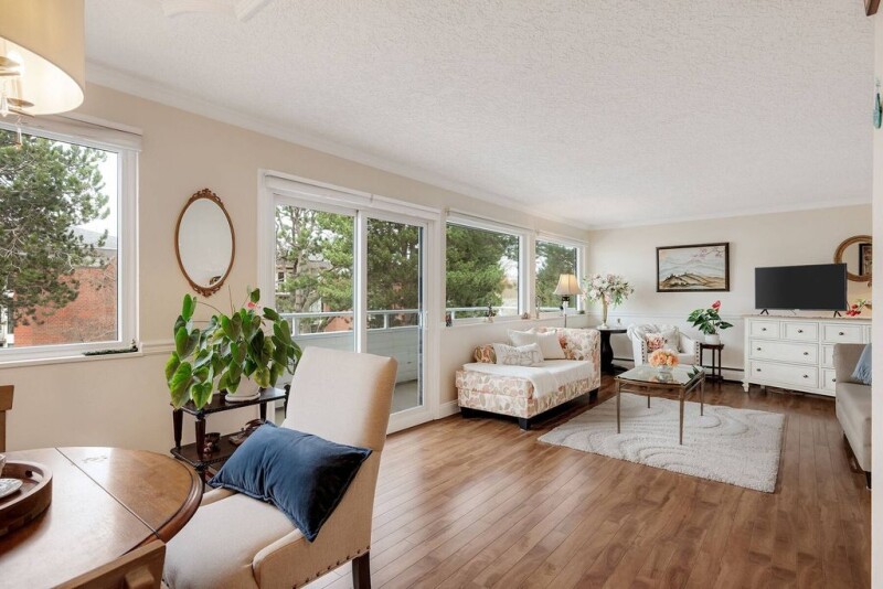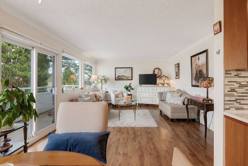 Oak Bay Treasure. This sunny and bright, two bedroom corner unit is tastefully updated to provide a comfortable and spacious home. Boasting engineered floors, a tastefully updated kitchen with granite counters and newer appliances and a fully updated four piece bathroom with in-floor heat. Located on the quiet side of this exceptionally well managed condo building, it benefits from a large balcony. This tree-lined residential street in Oak Bay is just a short walk to all of the conveniences of the Village of Oak Bay including shops, cafe's and the Monterey recreation centre. A pro-active and professional strata assures the maintenance of the building in a cost effective manner. Heat and water is included in the strata fee and there is one parking space plus additional storage on the level beside the unit. Children are welcome too! Seller would prefer a long closing or rent-back until the end of the year.