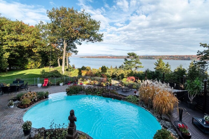 Exceptional area: 425 ft along the St. Lawrence River, descent by boat, breathtaking views of the River. Residence with sublime interior, noble materials, 23 rooms, 2-level garage. Inground-heated swimming pool + outdoor kitchen and living room. Large garage near the River. Intimate lot 89,000 sqf. Poss. heliport. A pure masterpiece!.