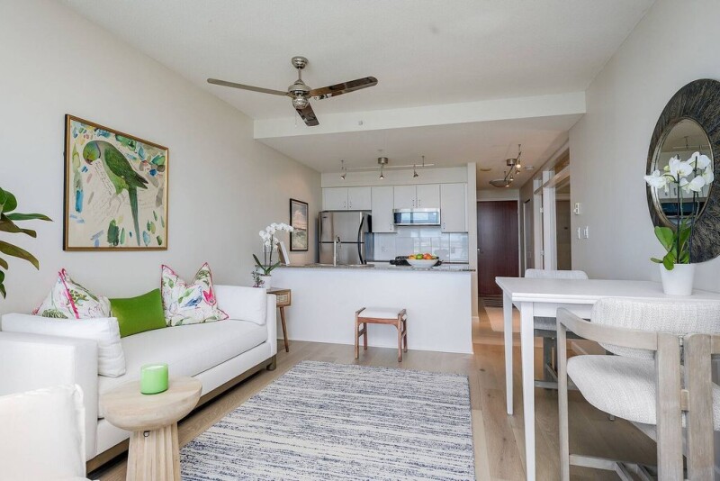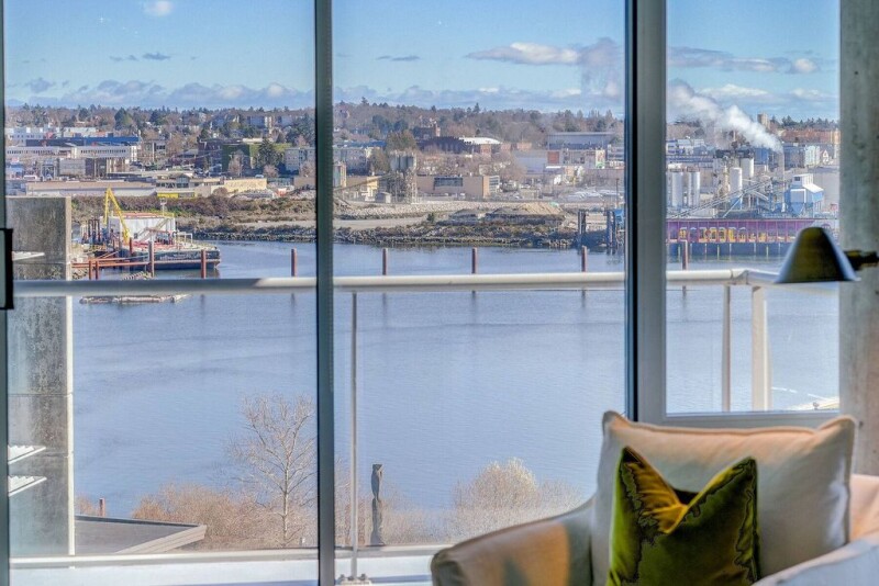 Stellar water views from this chic one bedroom modern condo in Parc Residences. Situated in a steel and concrete building with views of the ever changing Inner Harbour and vibrant skyline of beautiful downtown Victoria. Bright open floor plan with an abundance of natural light. Floor to ceiling windows offering unobstructed views. Move in condition with newer hardwood flooring, granite counters, stainless steel appliances, gas range, and white euro-style cabinets. Dining/living room combo with cozy fireplace leading to the balcony. Primary bedroom with lots of closet space and ensuite bathroom, and in-suite laundry. This iconic building features secure underground parking, separate storage, recreation room and fitness facility. A well run complex with pride of ownership throughout. Surrounded by parks, steps away to restaurants, grocery stores, paddle board/kayak launches and the Galloping Goose trail. In the heart of trendy Vic West and only minutes to downtown. A wonderful turnkey lifestyle.