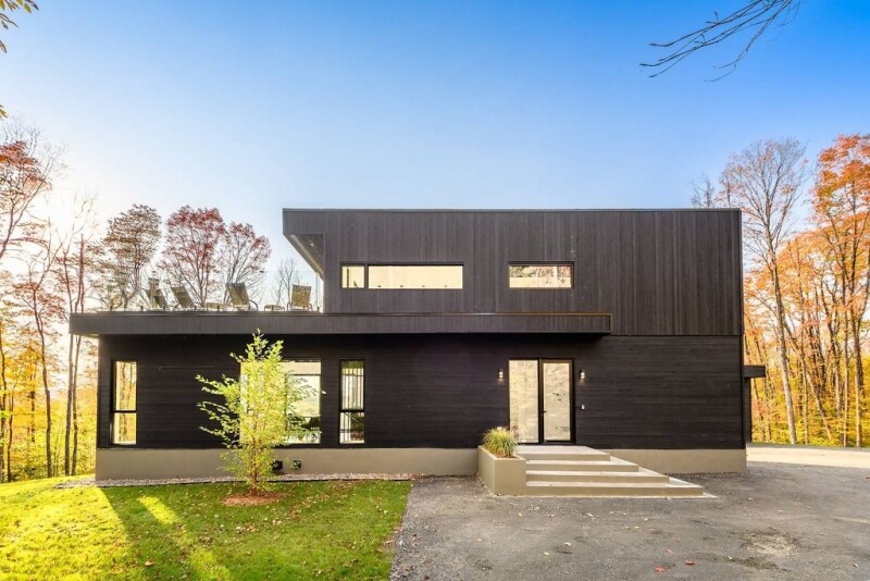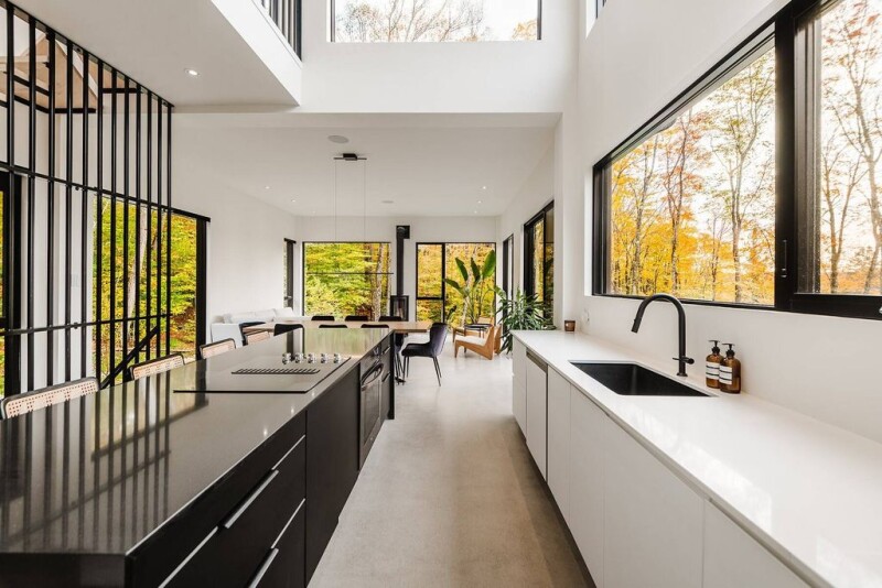 Le Chalet Des Rochers, designed by Karianne Boyer Architecture, is a new elegant and modern residence located in Mont-Tremblant. This 4-bedroom home sits on a vast lot of over 55,000 square feet. Just a 15-minute drive from the famous Tremblant ski slopes, hiking trails, and downtown, it offers breathtaking views of the surrounding nature through its large windows. With a bright and comfortable living space, every detail has been carefully thought out to create a minimalist and contemporary atmosphere, combining high-end materials and clean design.