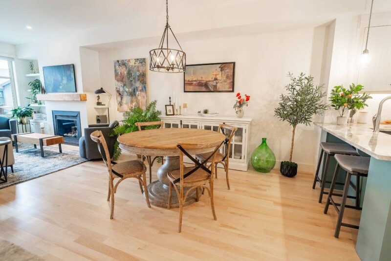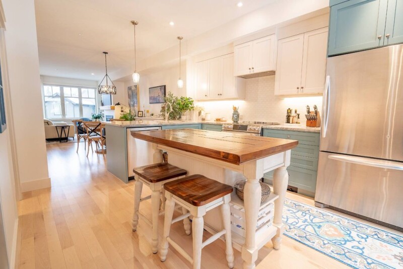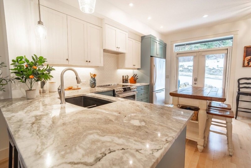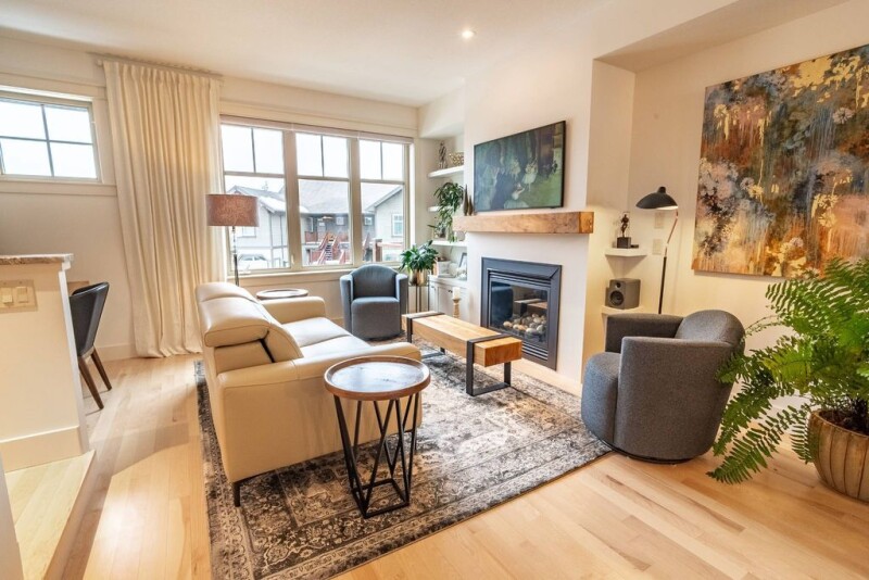 Warmth and comfort blend together in this tastefully renovated residence with meticulous attention to detail. This beautiful two bedroom, two and a half bathroom townhome offers a wonderful sense of “house” while still enjoying the benefits of luxury condo living.The main living area features a a bright open floor plan, with a freshly updated contemporary kitchen with matching marble countertop, Blanco sink, new GE Café double oven induction range, flush mount hood fan, updated plumbing and lighting, a built-in desk and coffee bar with custom Elm countertop and a two piece bathroom with heated floors. Birch hardwood throughout the main floor flows to the cozy living room with updated gas fireplace framed in custom-built cabinetry, Elm wood mantle harvested specifically for this home and a nook with large built-in desk lends itself to working from home. Upstairs is the primary bedroom and three piece ensuite with generous sized closets, motorized Hunter Douglas Silhouette blinds, washer/dryer closet and a large second bedroom with four piece ensuite. A lower-level flex room is finished to main floor quality with carpet and electric heating, perfect for a theatre/exercise room. Newer water tank, humidifier, circulating water pump and air exchanger in the mechanical room. Epoxy flooring in the garage and built-in cabinets for storage. Garden doors off the kitchen with Phantom Screens open to private patio area with gas bbq hook-up. Predator Ridge offers a year-round lifestyle and unparalleled amenities with two of Canada’s finest golf courses.
