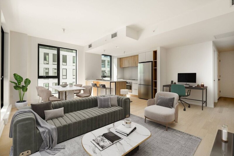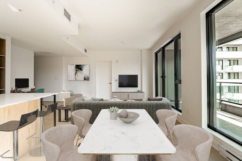 Oria Condominiums Phase 2 Quartier Solar | A rare corner suite featuring a spacious balcony terrace of 128 square feet (11.89 square meters). Thoughtfully designed with elegant plans and expansive floor-to-ceiling windows, this south-west facing unit offers delightful natural light and serene views of the gardens. Inside, the master bedroom overlooks the quiet courtyard for absolute tranquility. Included is one (1) garage space with a private electric vehicle charging station and one (1) storage locker. Bright and welcoming! The building boasts exceptional interior and exterior common areas.