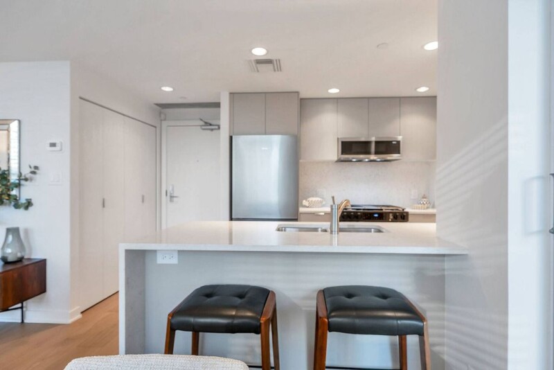 Location, location steps to George Wainborn Park and the waters of False Creek! Bright and spacious this air conditioned one bedroom plus den is professionally and substantially renovated, freshly decorated and ready for immediate occupancy. Brand new improvements include kitchen fully renovated, Samsung stainless appliances, four burner gas stove, engineered light oak hardwood throughout, remodeled bath plus new heat pumpP! Smart layout with no wasted space plus covered balcony with gas hookup for the BBQ. Den is ideal for the home office. Excellent ICON amenities, 80’ lap pool, steam room, fully equipped gym, billiards, theatre, meeting room, pitch and putt golf. Value 24/7 dedicated concierge services, EV ready parking stall and all minutes to Fresh Street Market and London Drugs.