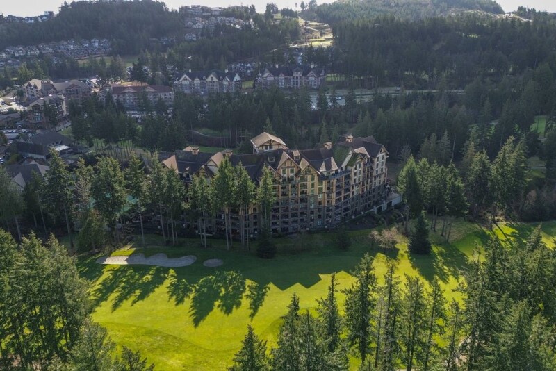 Welcome to Finlayson Reach, Bear Mountain's premier luxury condominium building. This two bedroom, two bathroom home boasts an open-concept design with 9-foot ceilings, hardwood floors, and floor-to-ceiling windows. The gourmet kitchen features granite countertops, high-end stainless steel appliances, a gas range, and an island-perfect for entertaining. Enjoy stunning views of the Jack Nicklaus golf course and Mount Finlayson from the covered balcony. The primary bedroom offers double closets, balcony access, and a spa-like ensuite. Steel and concrete construction ensures durability, while resort-style amenities include concierge service, secure underground parking, a fitness center, squash and tennis courts, a movie theatre, and a lounge. Walk to restaurants, a spa, a coffee shop, and the Westin Hotel. Steps to world-class golf, hiking, and mountain biking trails. Experience resort living just 20 minutes from downtown Victoria!.